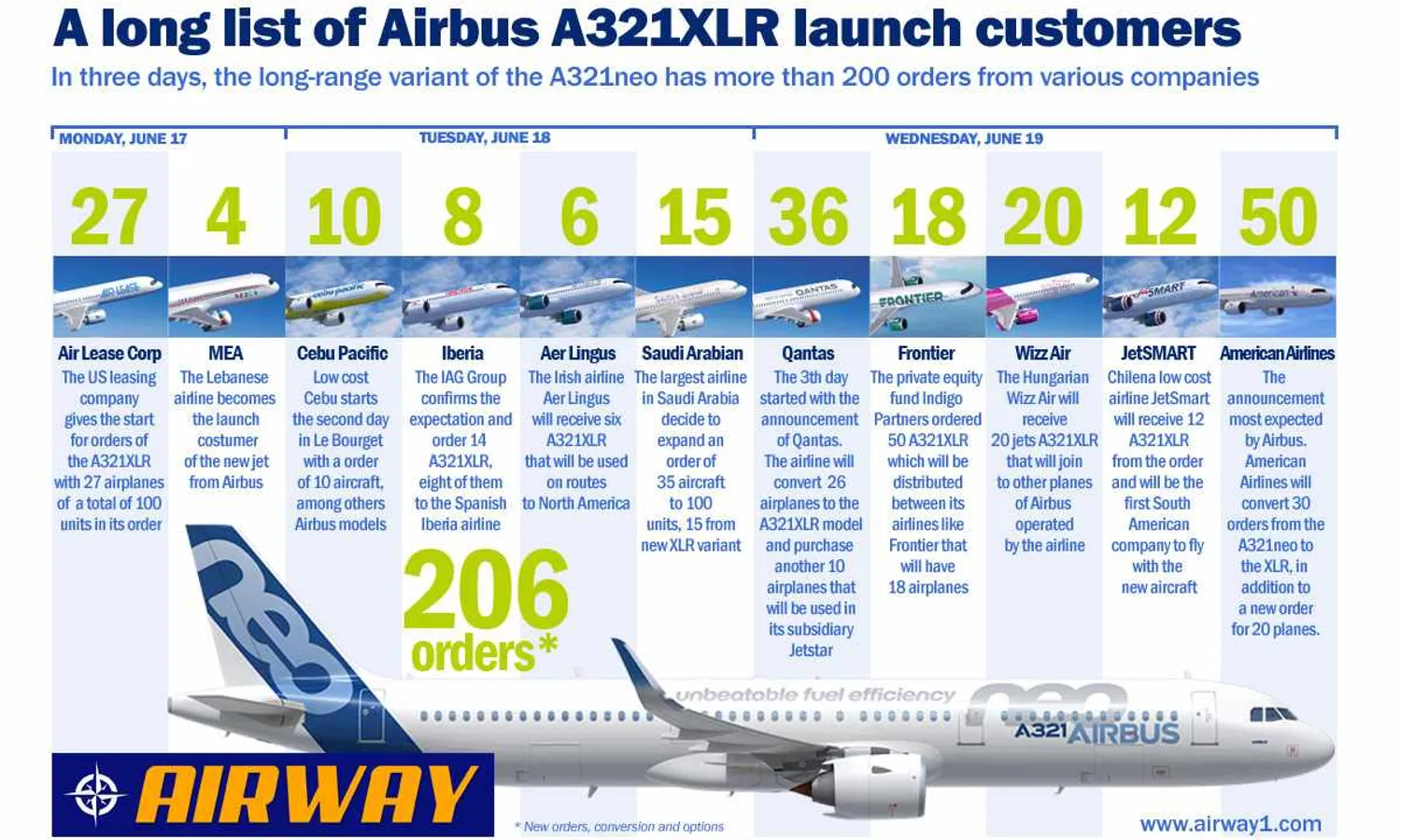 The twin-engine single-aisle aicraft with the longest range ever created was the first impact news at Le Bourget. Unveiling the new variant, Airbus has confirmed only one customer, the Air Lease Corporation with an order of 27 aircraft. However, soon after, Lebanon's MEA became the launch customer of the model with the acquisition of four aircraft. And so the first day was ended.