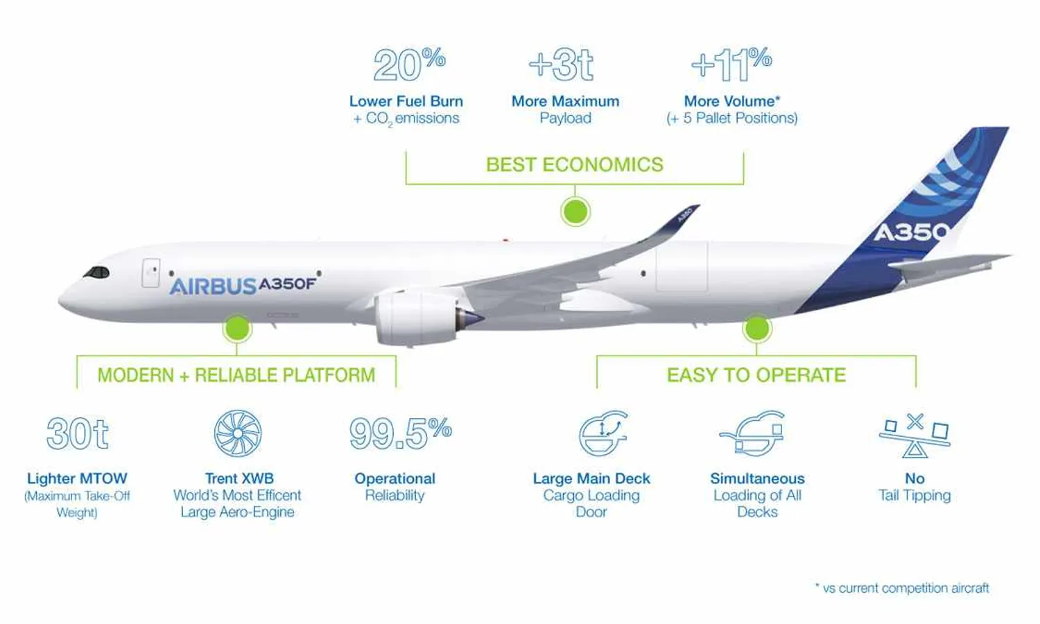Airbus also lists other advantages of the A350F such as the larger cargo door, 30% lower maximum takeoff weight and a longer range. Finally, the company bets on the commonality with other versions of the A350 to reduce costs with crew, maintenance and spare parts.