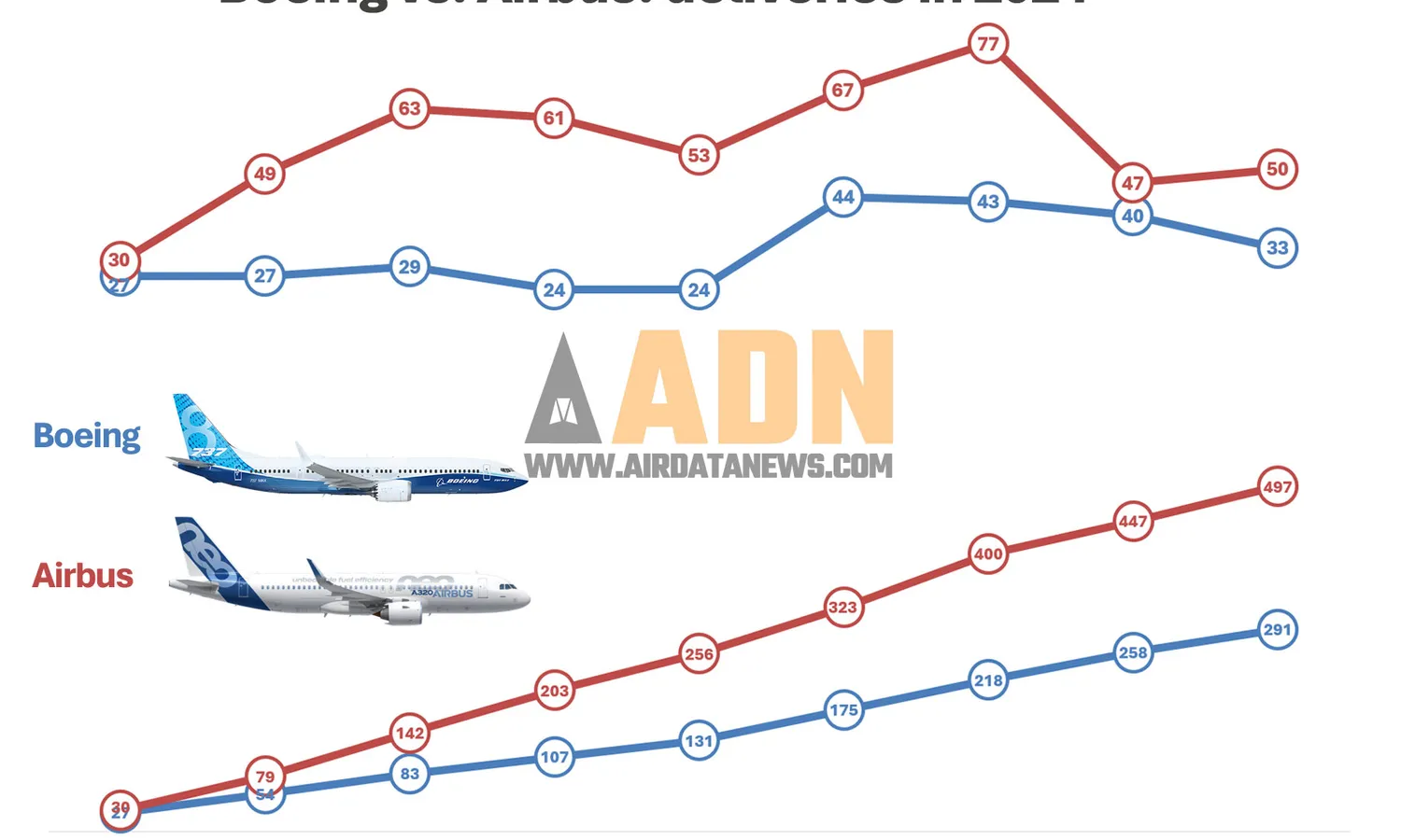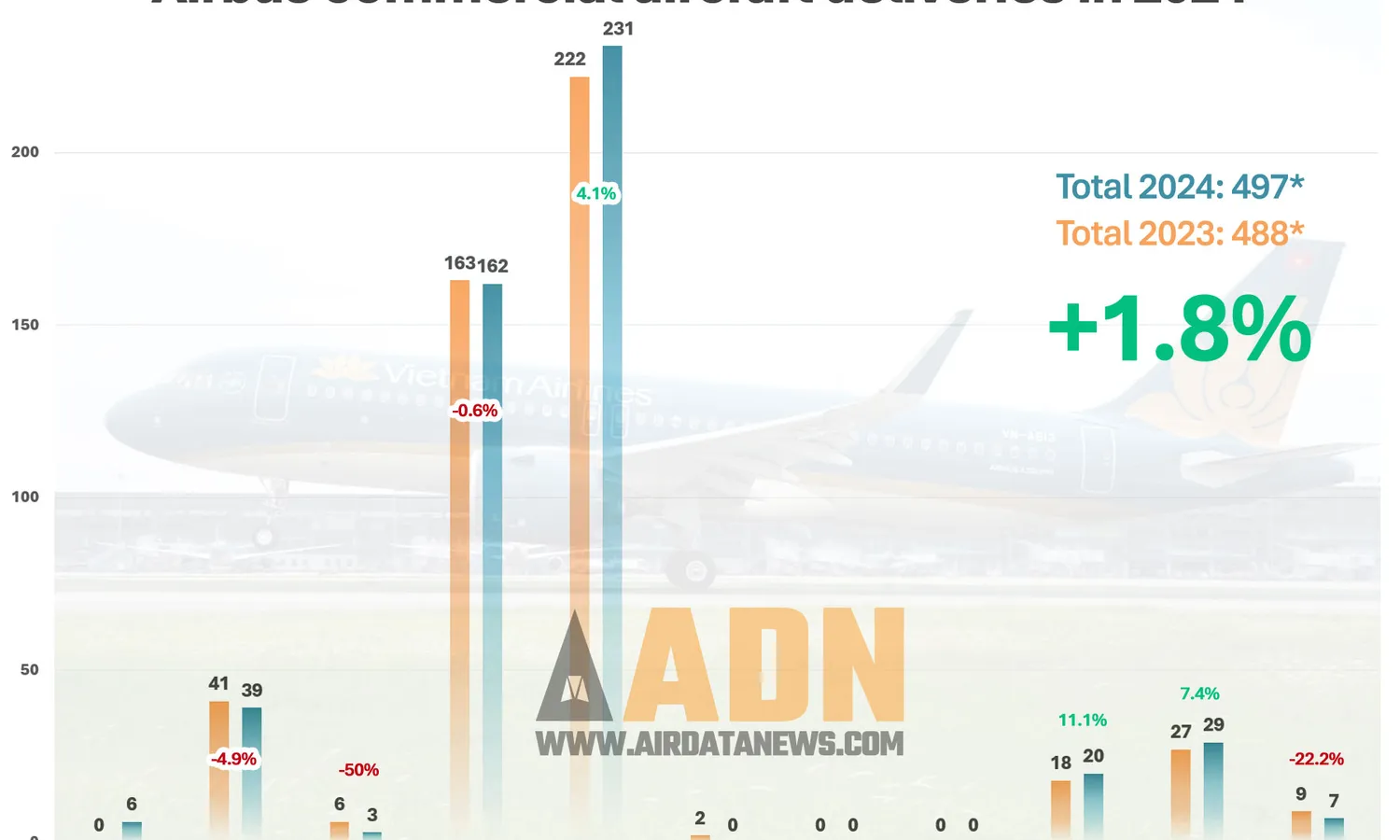 The widebodies A330 and A350 have the same numbers as in 2023, with 20 and 36 deliveries, respectively. Only the A330-900 shows greater growth, with 9.8% above last year.