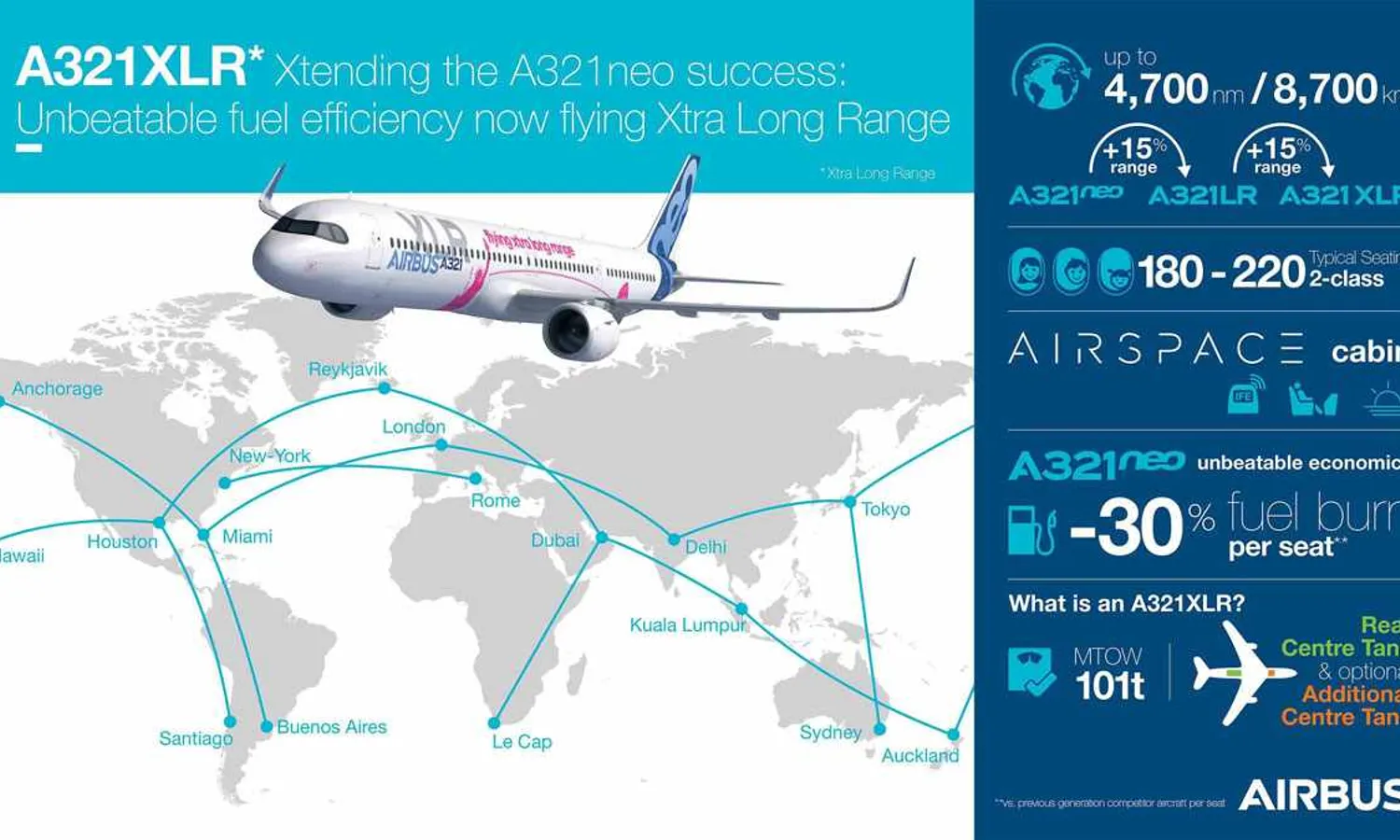 The maximum passenger capacity of the A321XLR is 244 seats in a single class, however, it should carry between 180 and 220 passengers on intercontinental flights with a two-class layout.