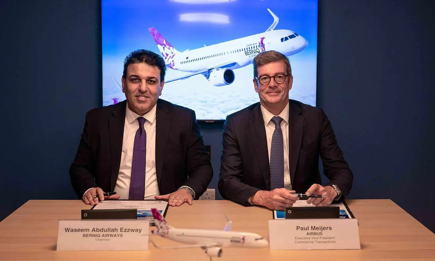 Libyan airline Berniq Airways repeated the same pose for the photo with its CEO, Waseem Ezzway, and Airbus’ executive vice-president of sales, Benoît de Saint-Exupéry, to announce an order for six A320neo family jets in Farnborough.