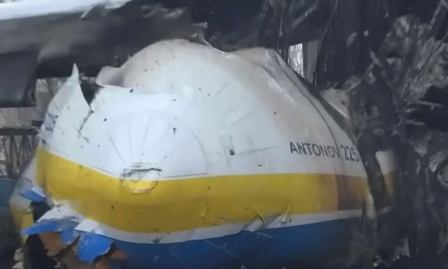 After unclear footage suggested the world's largest aircraft had been hit by military forces, a Russian TV report showed for the first time the Antonov six-engine jet with its front end completely destroyed.