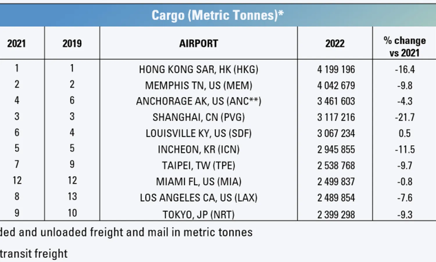In the ranking of airports with the highest cargo movement, the list is led by Hong Kong Airport, followed by Memphis, Anchorage and Shanghai. There is no European terminal among the top 10.