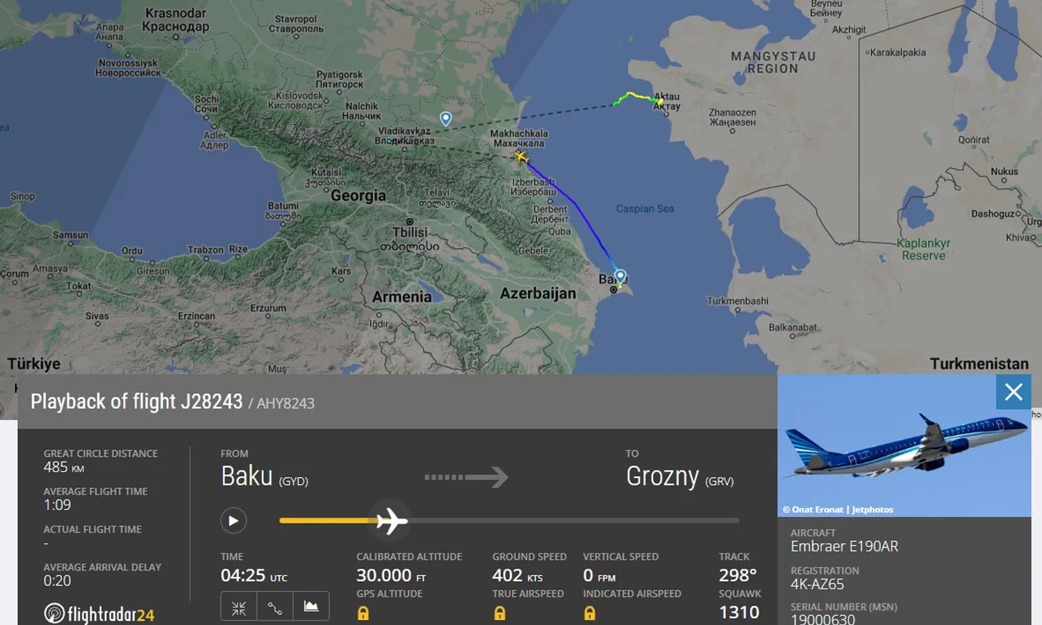 Tracking data from FlightRadar24 shows that the aircraft was flying at 30,000 feet 36 minutes after taking off from Baku and then began to lose altitude rapidly.