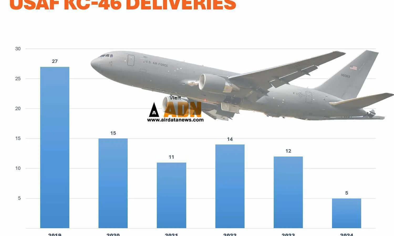 The budget for fiscal year 2024 (between October 2023 and September 2024) foresees the delivery of 15 jets, but so far ten aircraft have been sent.