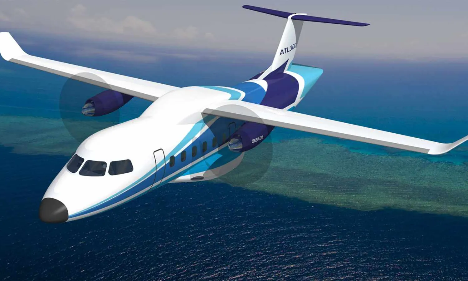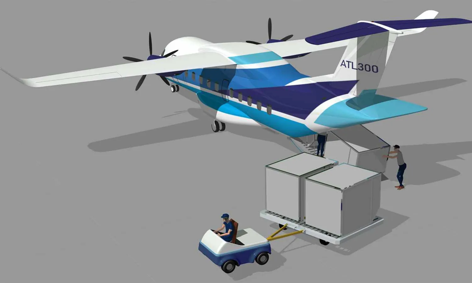The ATL-300 is in theory a rival to the ATR 42, the smaller version of the best-selling regional turboprop on the market. The aircraft's layout features a T-tail, wing-mounted engines and winglets to reduce drag.