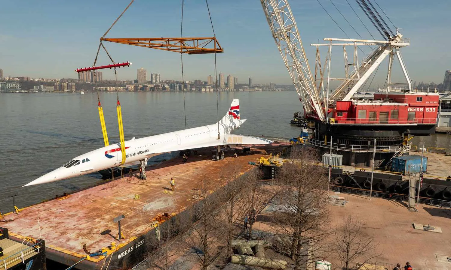 The work that includes reapplication of the British airline’s livery was completed days ago and this week the supersonic jet was lifted by a crane onto a barge on the Hudson River, to be taken back to Pier 86.