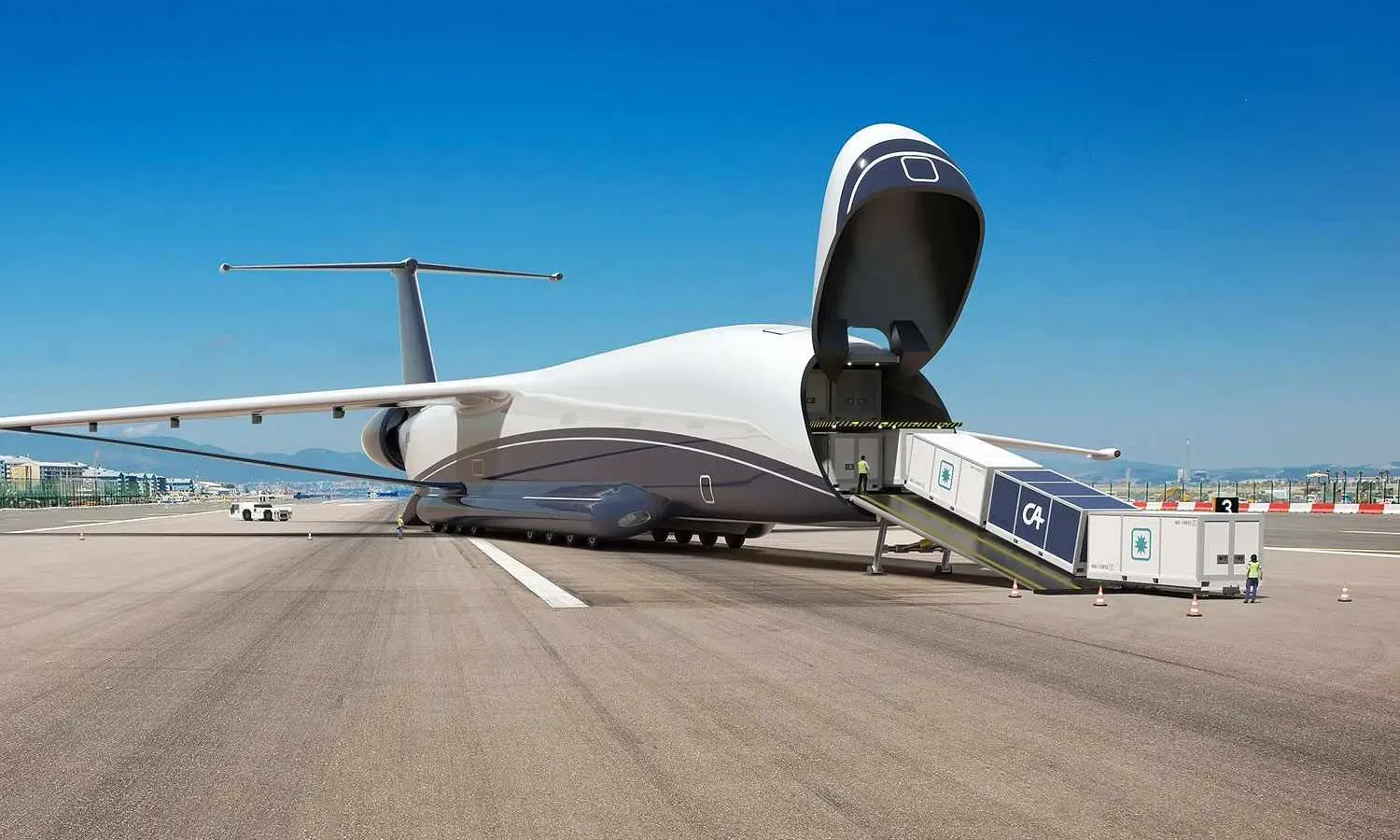 For this reason, the huge cargo drones feature a rectangular fuselage with front and rear access, like military transport aircraft.