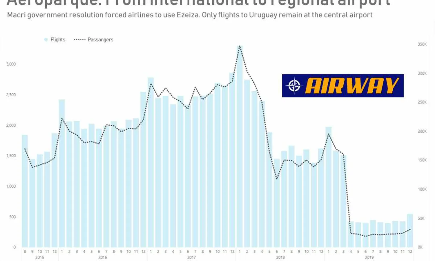 By restricting operations at Aeroparque, the international movement dropped from a peak of almost 350,000 passengers in January 2018 to 19,000 people in June last year, also reflecting the economic crisis in Argentina.