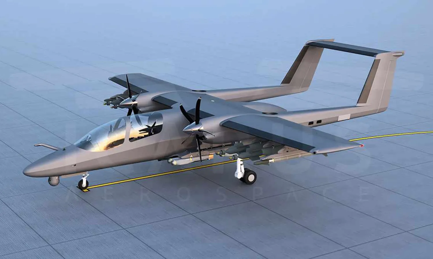 The same double-boom and fuselage configuration that is attached to the wings. The TAV, however, has a two-seat tandem cockpit with a narrower canopy. The twin-engine turboprop also features an overhead refueling boom and 1,700-shp engines with five-blade propellers.