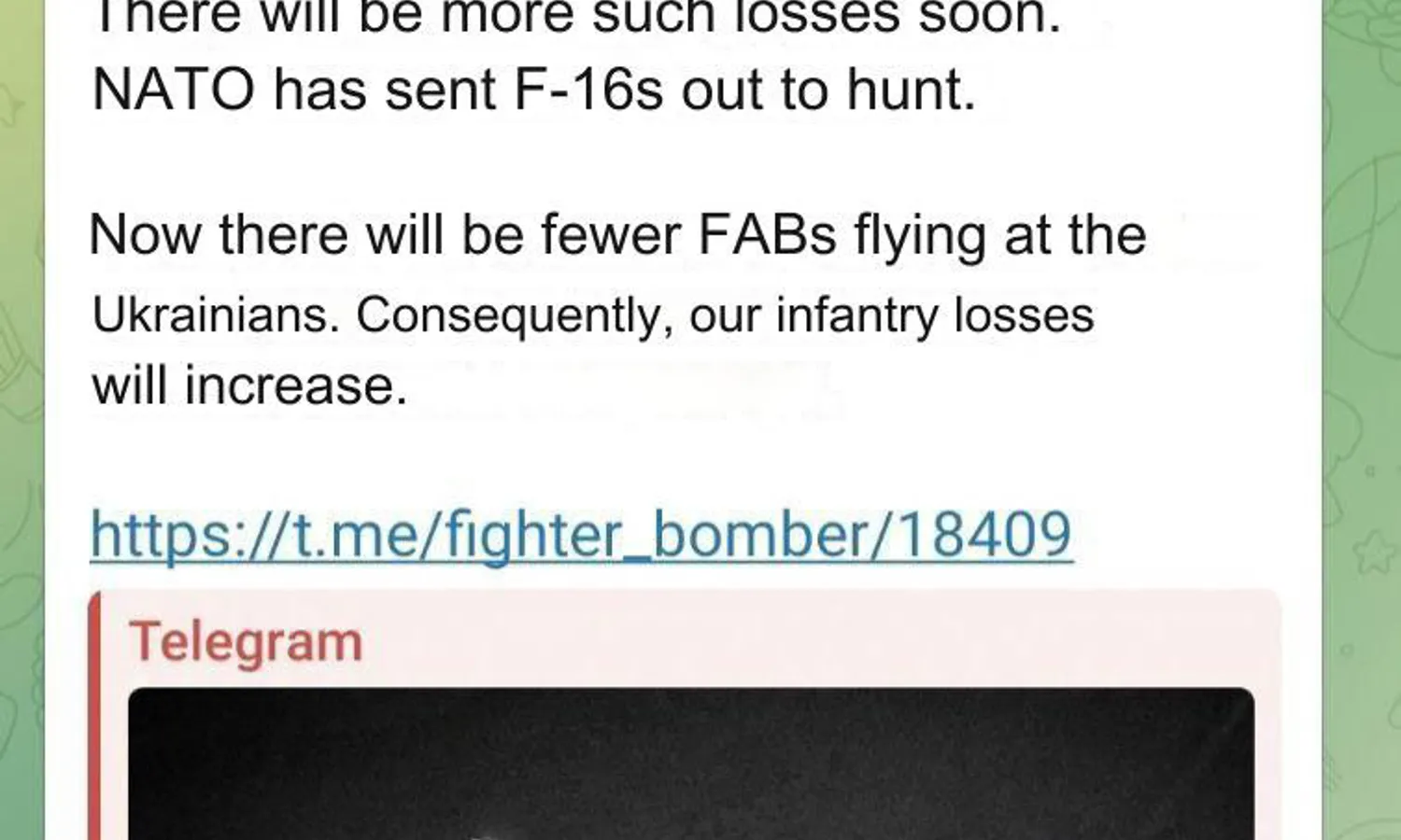 The pro-Moscow channel, however, claimed that the Russian aircraft had apparently been shot down by an F-16, a Lockheed Martin fighter that has been operated by Ukraine since late July.