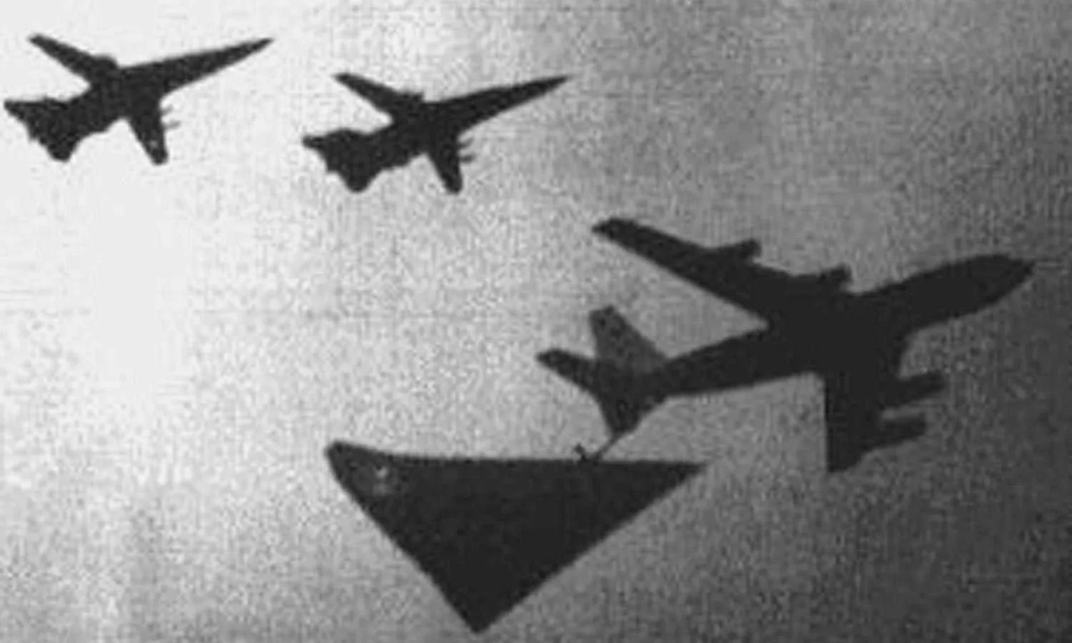 In August 1989, however, Chris Gibson, an observer from the Royal Observer Corps who was on a gas platform in the North Sea, 100 km off the coast of Norfolk, England, reported seeing a strange scene: a triangle-shaped aircraft was refueled in the air by a KC-135 tanker.