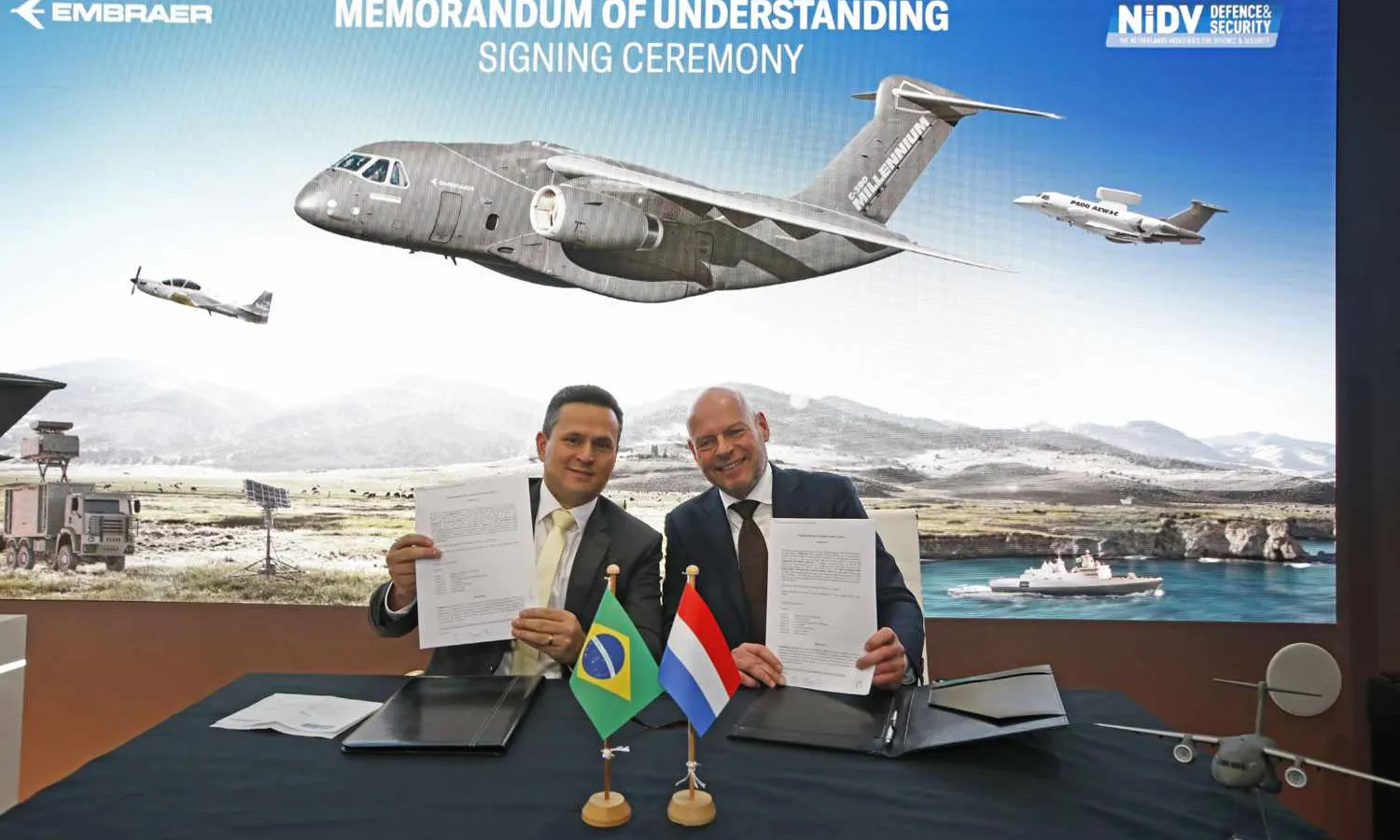 Embraer signed a Memorandum of Understanding (MoU) with Netherlands Industries for Defense & Security (NIDV) on Thursday during the 34th NIDV Exhibition for Defense and Security (NEDS 2023).