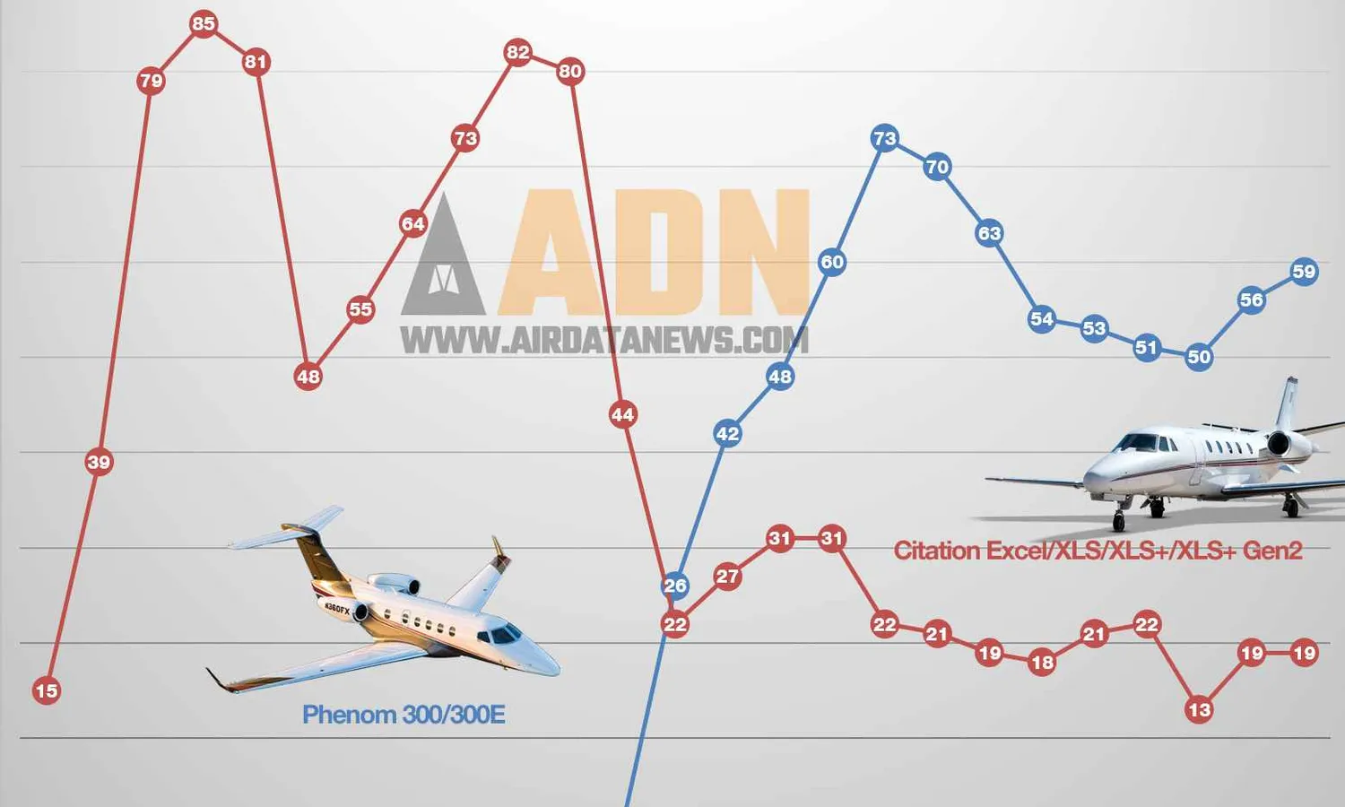 The Excel family is larger, having accumulated 1,030 aircraft since 1998, but deliveries fell significantly from 2009, the year the Phenom entered service.