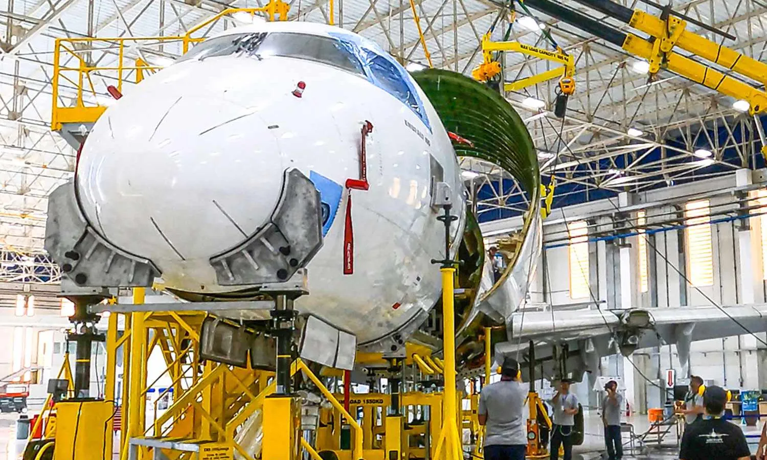 The images show the replacement of part of the front fuselage section of the original E190 with a new one, with a large opening, where the aircraft's cargo door will be installed.