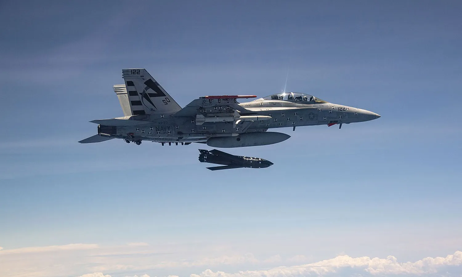 The Lockheed Martin carrier-based naval fighter was imaged flying with two AGM-158Cs in underwing pylons on Sept. 10.