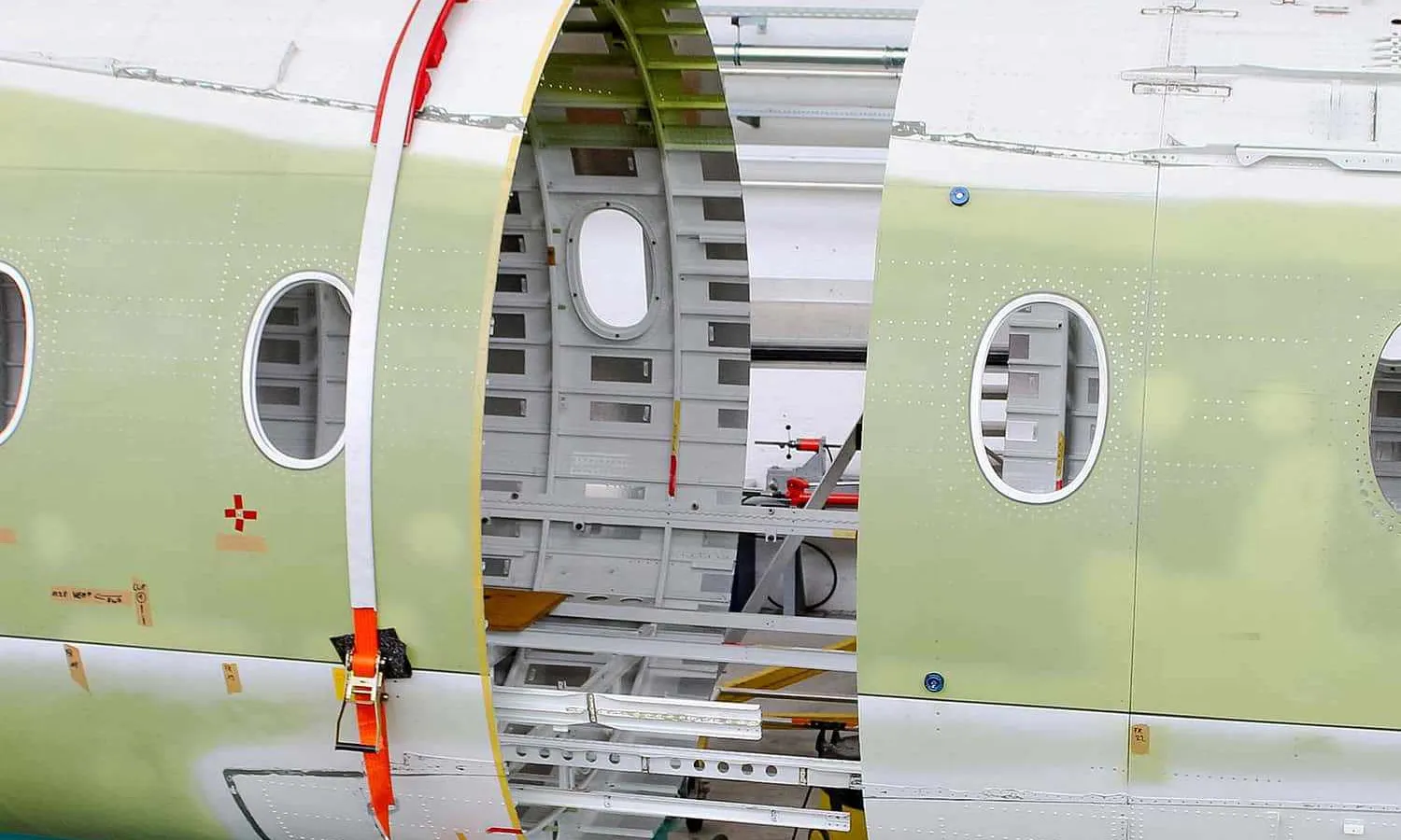 A released image shows the aircraft’s front and center fuselage on trestles at the company’s facilities in Germany.