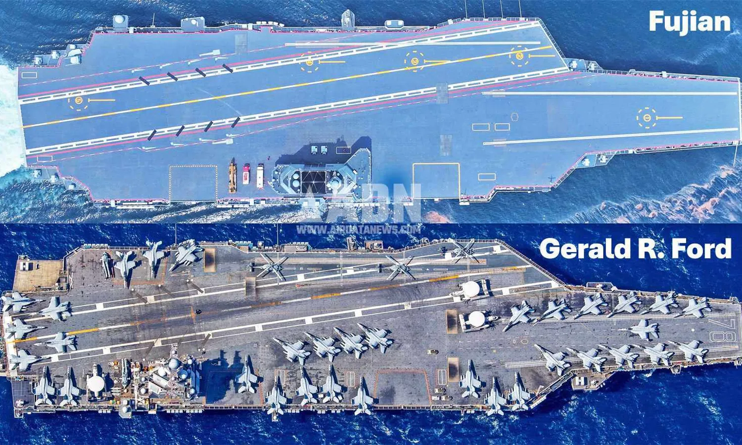 The US ships have three elevators, which indicates that the Fujian would carry fewer aircraft.