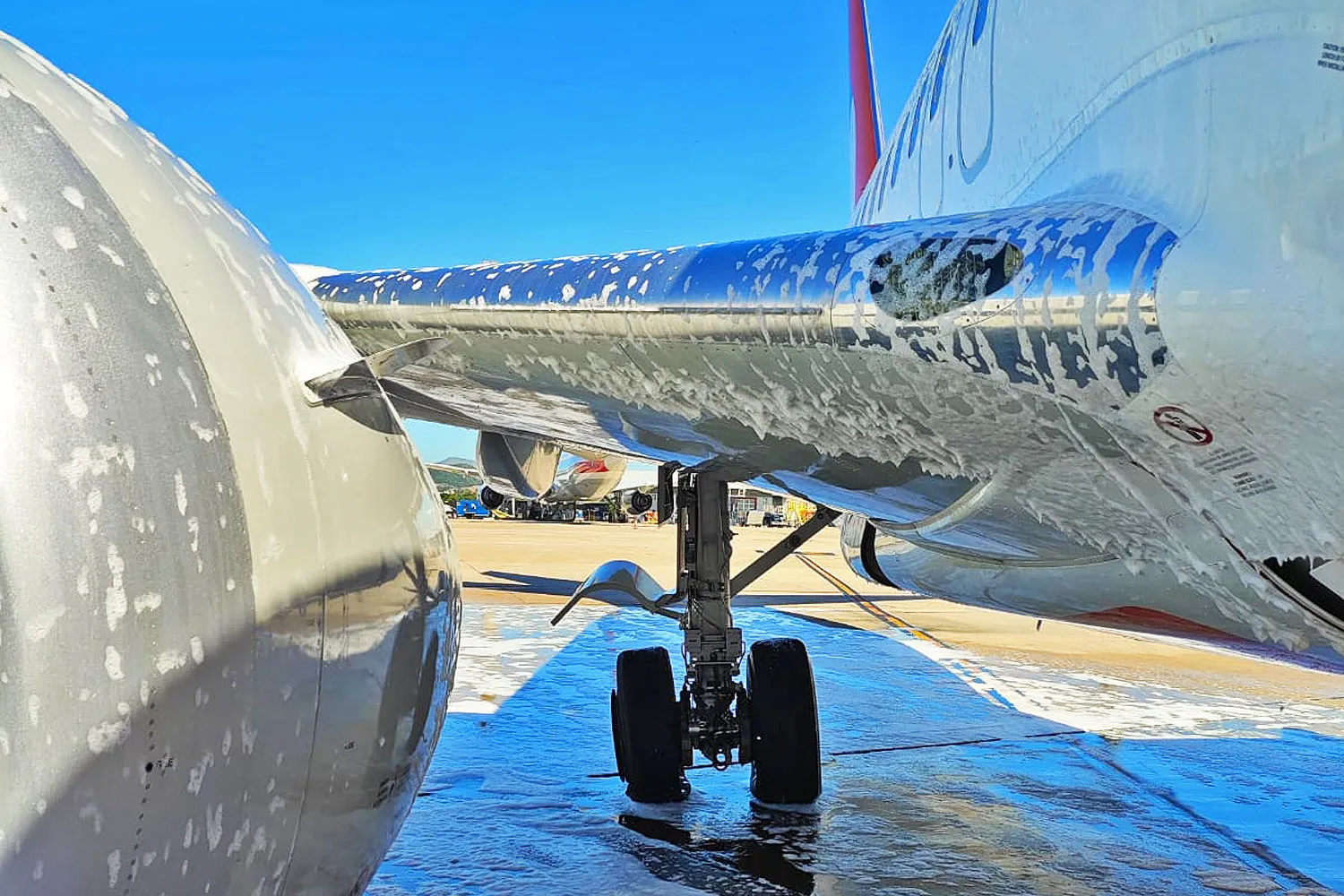 A picture of the landing gear shows one of the tires damaged, but the structure without apparent damage.