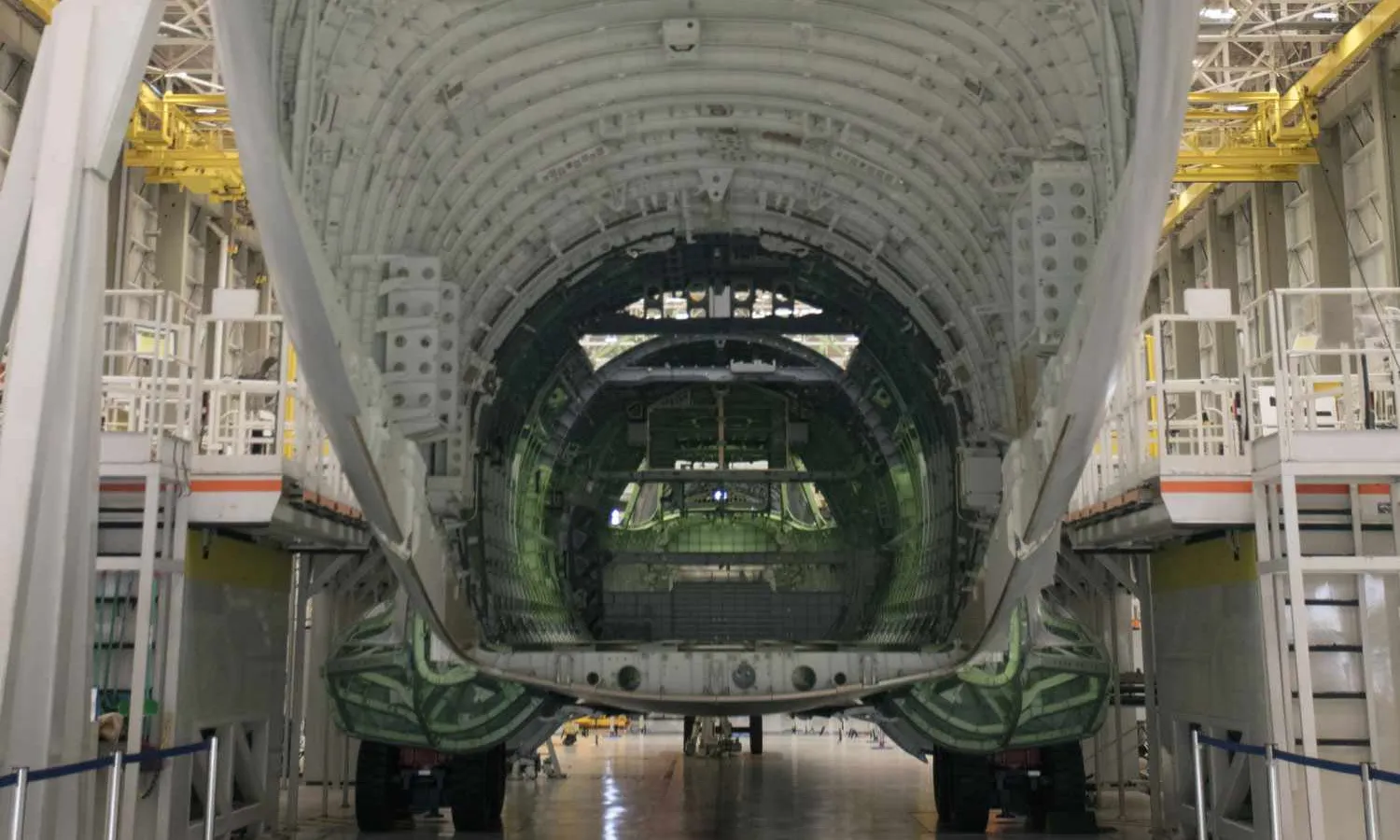 The airlifter is in the process of assembling the half wings on the aircraft's fuselage, with both structures already painted in Air Force colors.