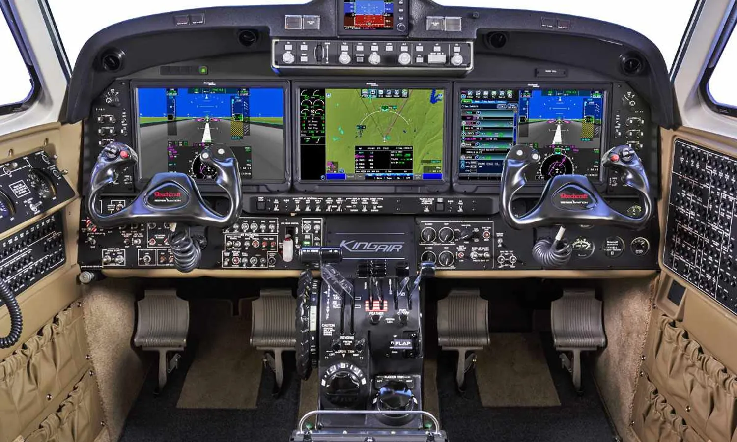 The new King Air now has the "ThrustSense Autothrottle", which automatically manages engine power, from the start of takeoff to the stages of ascent, cruise, descent and landing. The manufacturer also introduced a new digital pressurization control, which can program levels during the aircraft's ascension and descent, reducing the crew's workload - the pressurization gauges are now part of the Collins Aerospace Pro Line Fusion avionics suite.