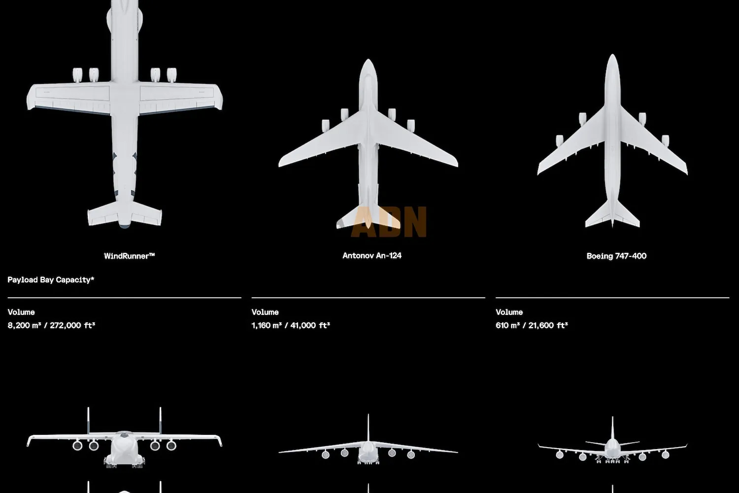 The payload capacity of 72.6 tons is not impressive, nor is its low speed for a jet (Mach 0.6), but the WindRunner makes up for these issues with superlative dimensions.