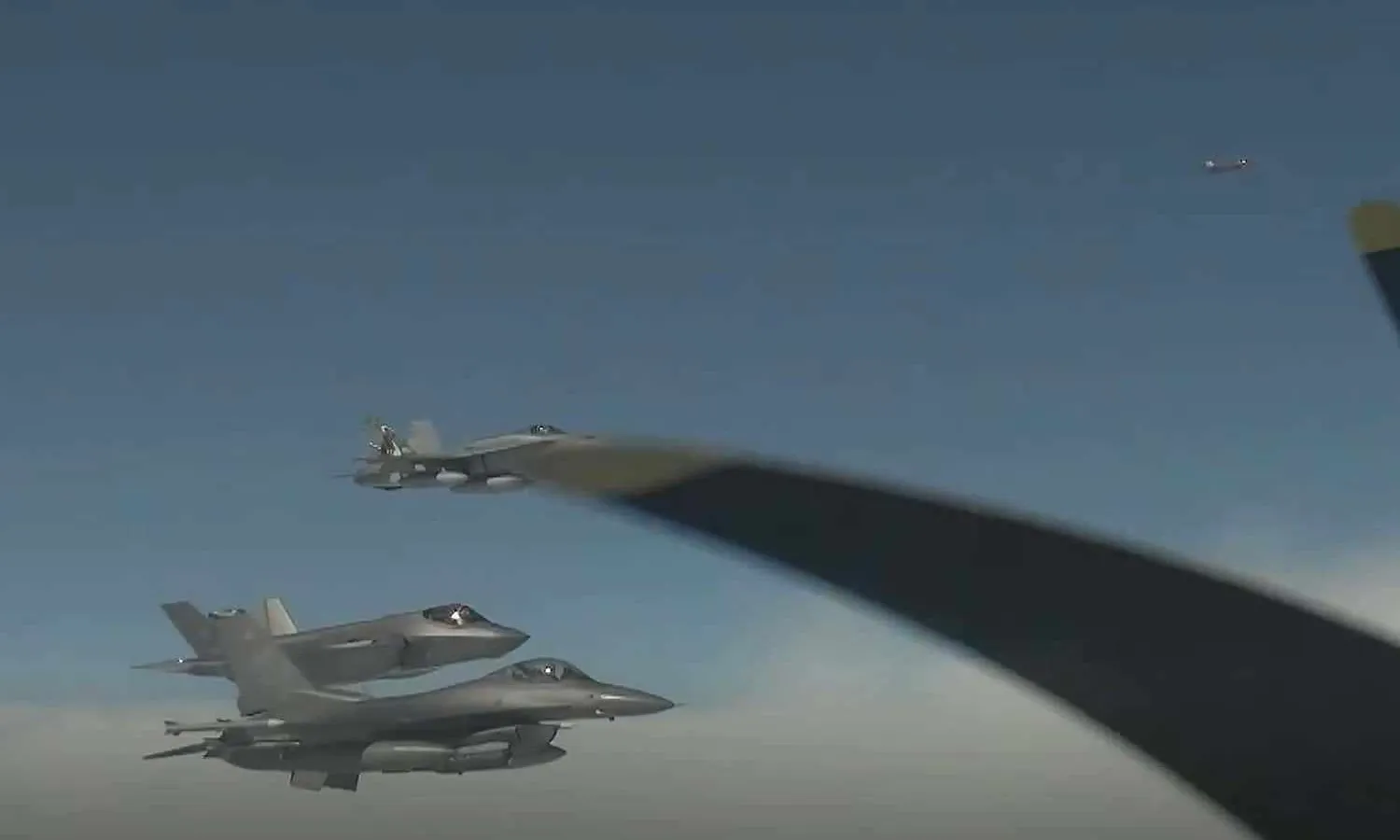 The aircraft were escorted by US F-16 and F-35 fighters and Canadian CF-18 fighters.