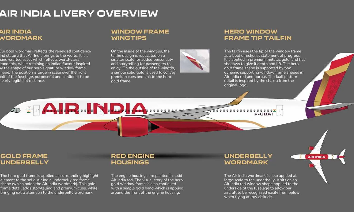 The new livery uses red, purple and gold colors, with "Air India" written in large modern letters. Like Emirates Airline, the Indian carrier painted the belly of the planes in red with its "wordmark" replicated in white.