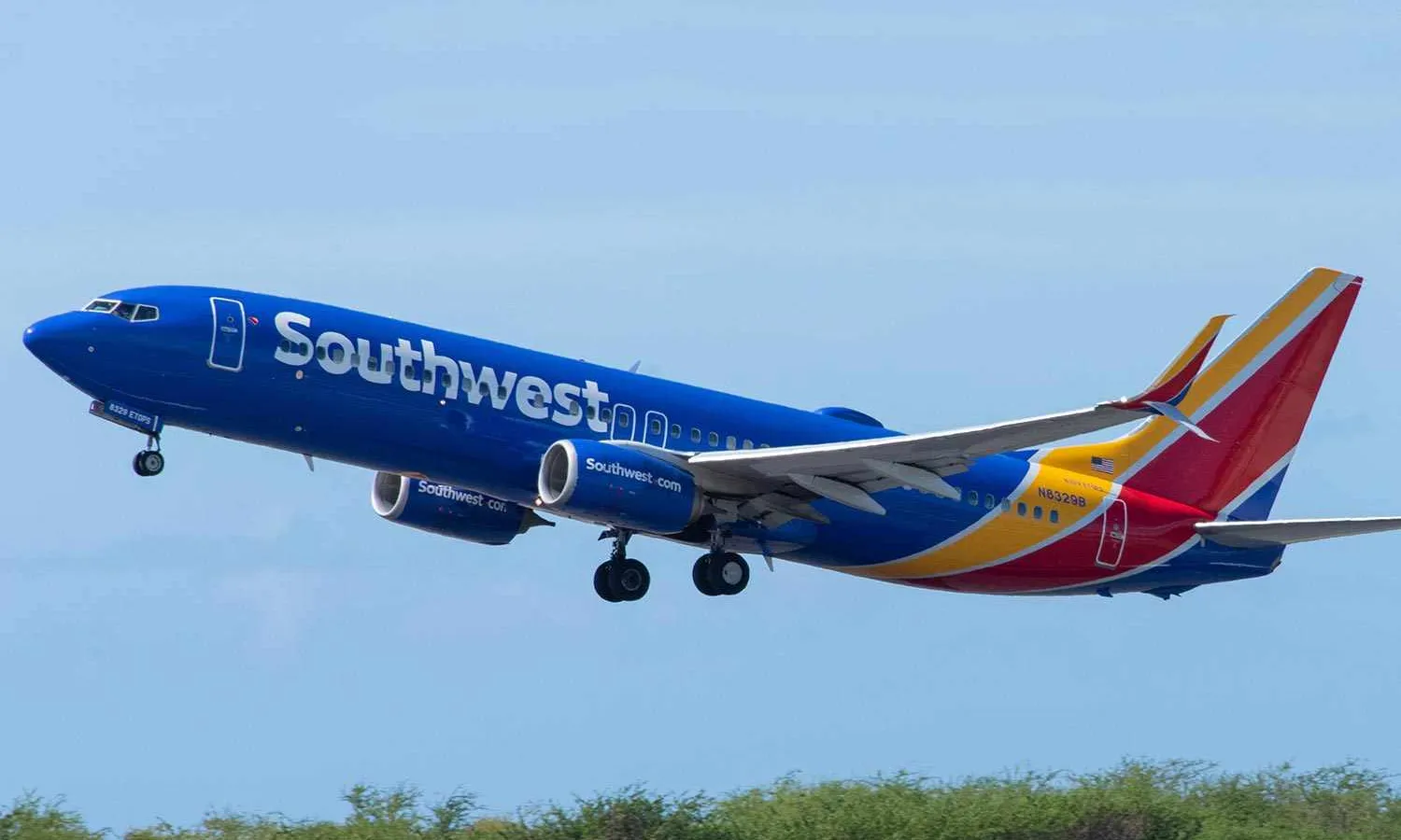 A Southwest Airlines Boeing 737-800 suffered damage to the right engine cover after taking off from Denver International Airport on Sunday.