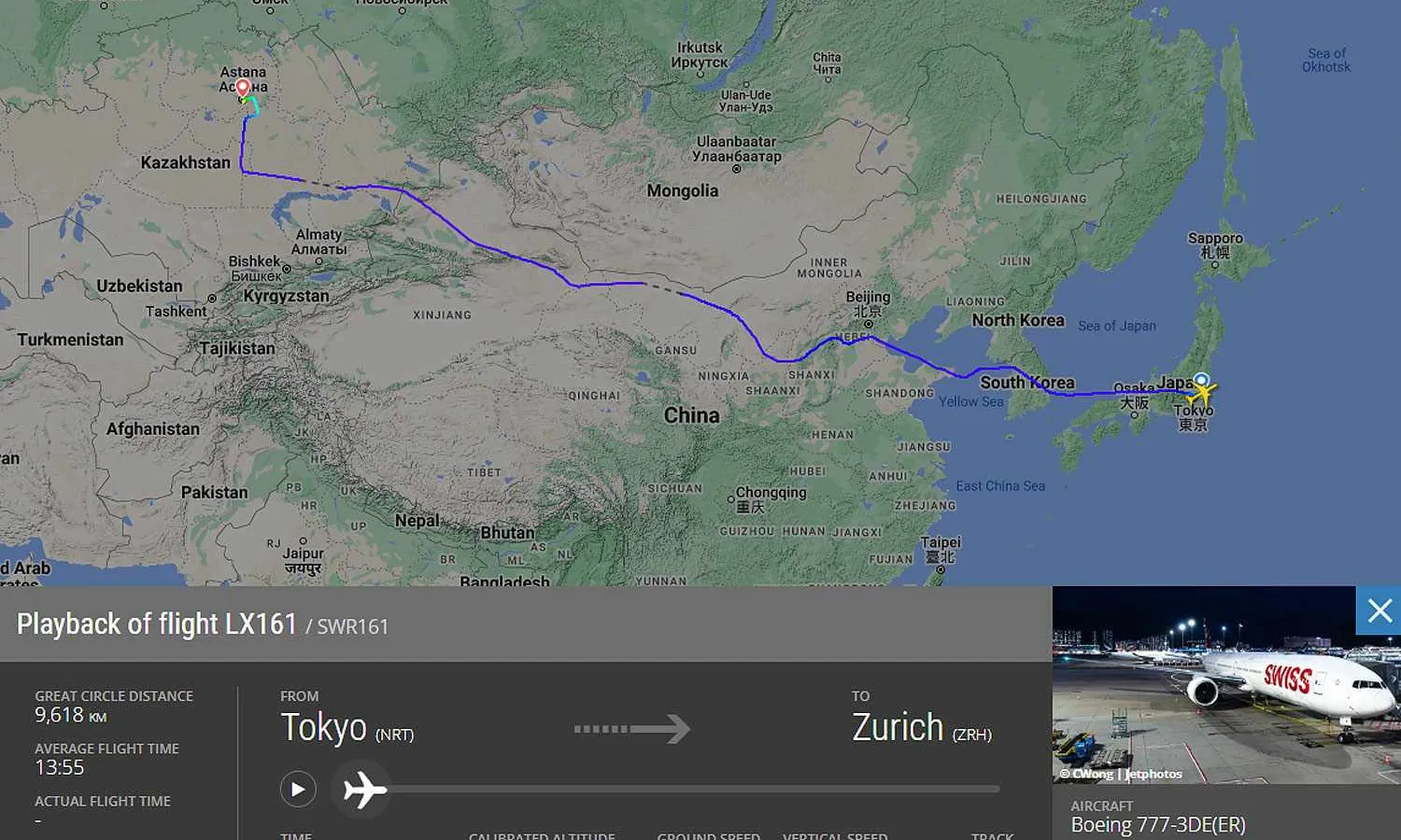 The Boeing 777-300ER, registration HB-JNI, took off from Tokyo bound for Zurich and instead of following the usual polar route to reach Europe, took another route, passing through South Korea and China.