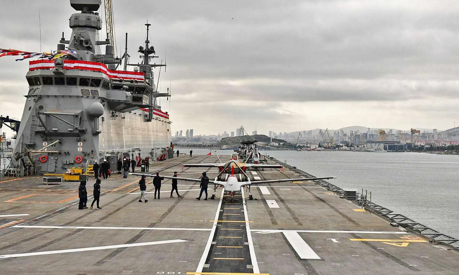 On the flight deck, in addition to Bell AH-1 Cobra attack helicopters, were Bayraktar and Kizilelma drones, both designed and built by Turkish manufacturer Baykar Technology.