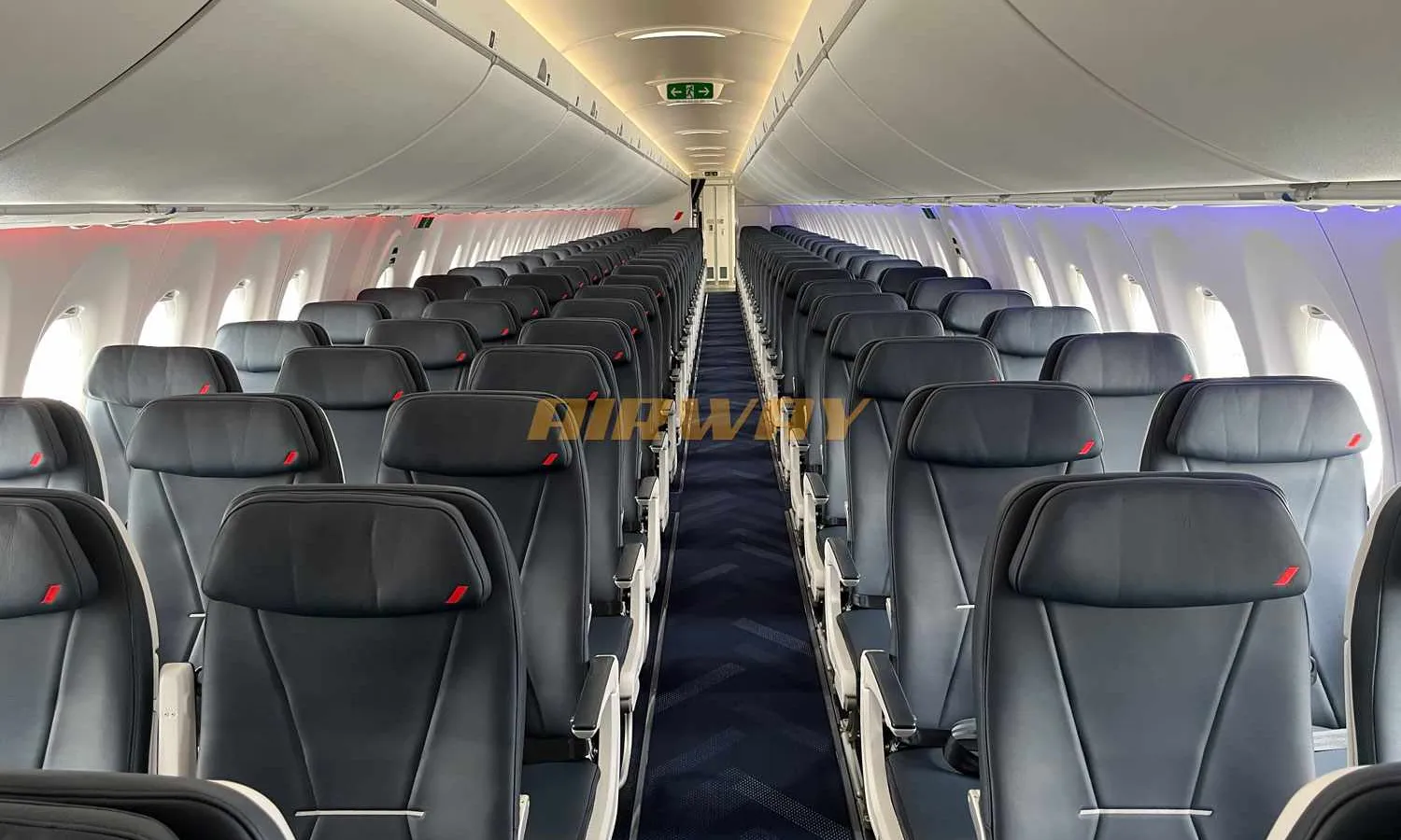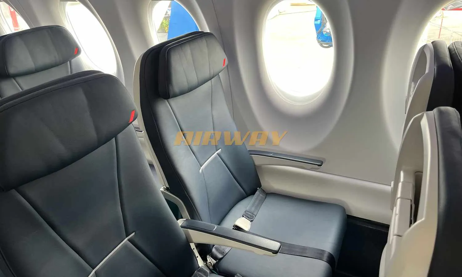 Going to the passenger cabin, you can see a generous amount of space, much larger than that of the Embraer E2. With rows of five seats, the A220 follows the 3+2 configuration of the DC-9 and Fokker 100.