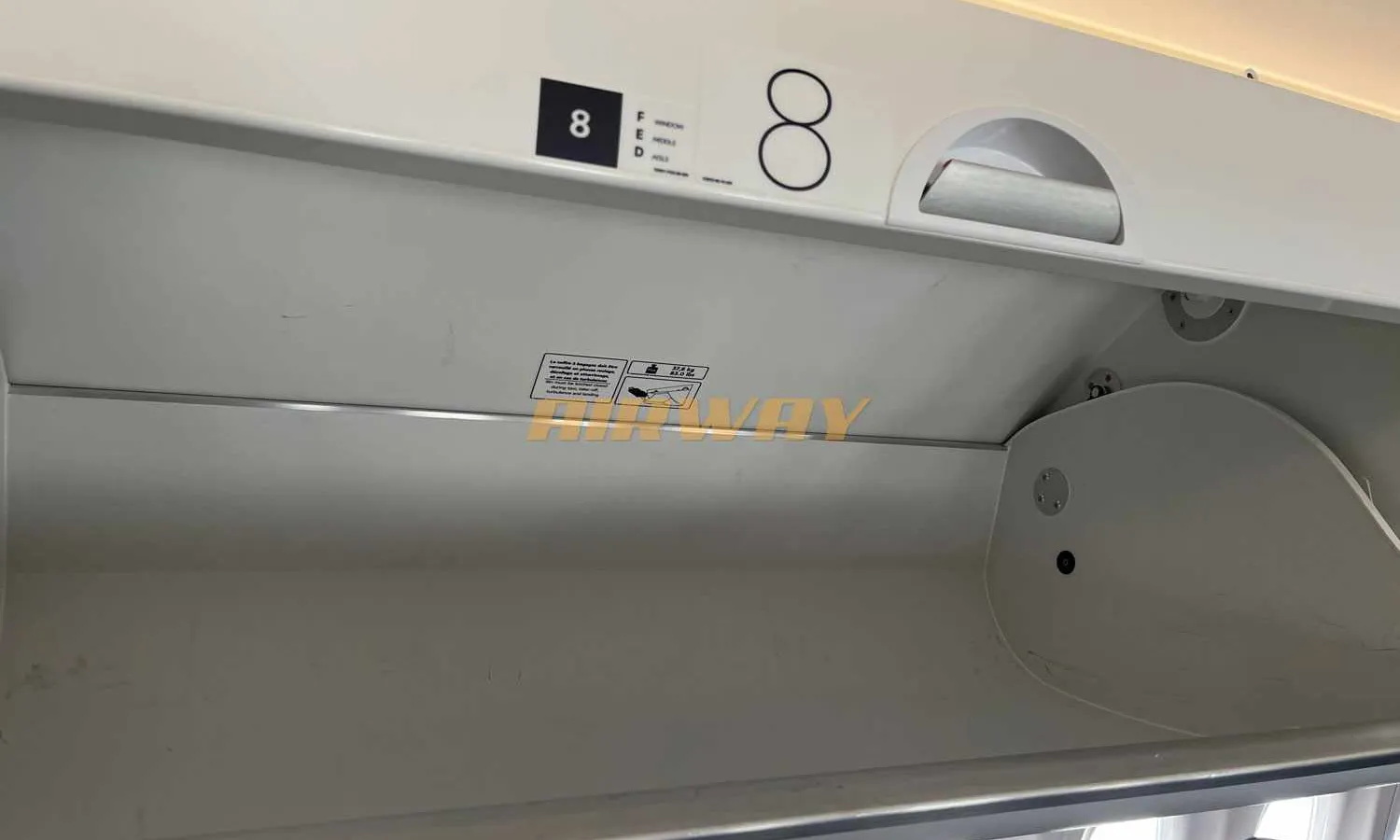 The overhead bin above the seats has a "Boeing-style" opening where the lid slides down. But Airbus will change that pattern to an upward pull-up to gain more space.